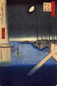 永代橋から江戸湾を臨む。右側は弁才船(輸送船)。左側は漁船。白魚漁をするかがり火。