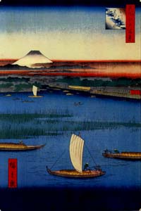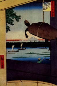 深川を貫通し、総州へとつながる小名木川の河口に万年橋がある。北斎の絵(「富嶽三十六景」のうち「深川萬年橋下」)でも知られるように太鼓橋の形状をしていたが、この絵ではそれは感じられない。前記した北斎も万年橋とともに富士を描いており、なぜか万年橋には富士が合わせられる。現在では深川から富士を仰ぐことを恐らくできないだろう。