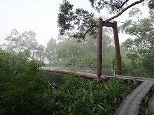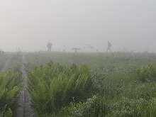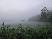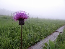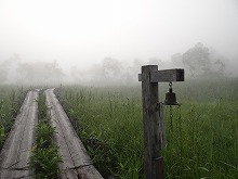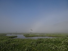 山小屋の朝は早い。4時過ぎから朝食を待たずに出発していく人たちも少なからずいる。彼、彼女らを見送ると直ぐに朝もやのなかに沈んでゆく。6時の定刻前に食堂が開いた。直ぐに食事を済ませ、ご飯に対しておかずの数が多かったので、持ち運びができる味付海苔を持ち帰る。6時9分出発。今日は長躯、奥鬼怒温泉を目指す。見送る者もなく私も朝もやに溶けていく。木道脇に鐘がおいてある。昨日のレクチャーでクマよけと話されていたものだ。木道が少し高くなる場所がある。これも小動物の通路と解説されていた。しばらく歩くと朝もやが霧散してきた。青い空が増してきた。これも昨日のレクによる知識だが、尾瀬には白い虹が見えるときがあるという。通常の雨粒は光を赤から紫まで分光するのに十分な大きさがあるが、霧の滴では光を十分に分光できず、白い光のままだという。上がりたての太陽を背にして、わたしにもそれらしく白い虹がみえたような気がしてシャッターを切った。本当に白い虹なのかはすこし自信がない。