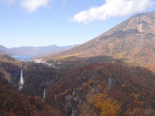 明智平駐車場に戻ると丁度バスが来た。しかし混んでいてなかなか発車する様子がない。また既に渋滞が始まっているようで、次のバスの状況もよくわからない。10時25分、明智平駐車場から今日をスタートすることにする。すぐにトンネルとなる。車道より一段高くなった歩道風の構造物が続いているので、自動車脇を歩くが特に支障はない。やがてトンネルと抜け、中禅寺湖に下っていく。今日も華厳の滝は時間節約のため、上部からの拝観とする。2ヶ月前と同じ勢いの滝があった。ただ滝を囲む夏の真緑の森が秋の装いとなっていた。滝の展望台から後方を振り返ると、先ほどまでいた明智平展望台上に豆粒より小さなゴマ粒ぐらいの人らしき黒いものが見えた。