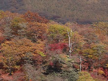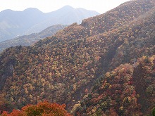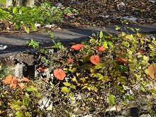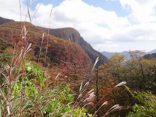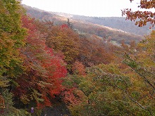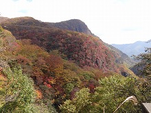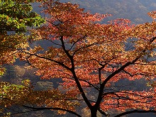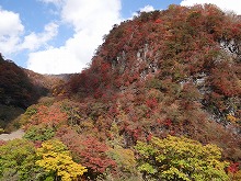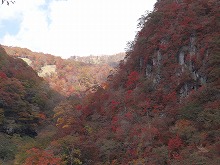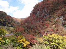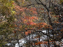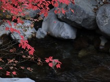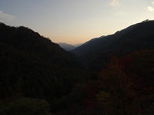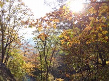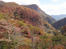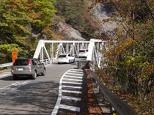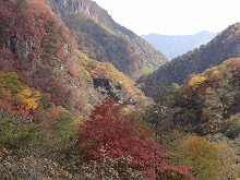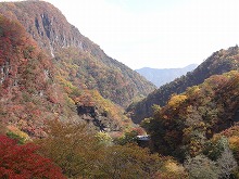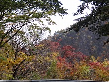 下の句はすんなりと出てきたが、上の句でしっくりするのが出てこない。宿題として残す。一期一会となる秋の夕景をすっかり堪能した。気がつくとかなり日が傾いてきた。遠くにエンジン音がするようにもなってきた。すぐにはわからなかったが日足トンネルの足尾側出口が近いようだ。最後の大曲を終えると、この旧道は国道と神子内川を隔てて併走する。眼下の沢の岩々は、奥鬼怒の崩れて間もない角張った礫でなく、幾千万年かを経て角のまるまっている。これに手を伸ばすかのような枝ぶりもよい鮮やかな紅葉で、明智平、いろは坂から続く秋の一日を締めくくってもらった。