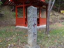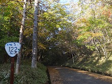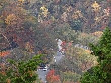 200mほど下り、海抜1,106mの標識のある中の茶屋跡に過ぎる。明治天皇の事跡を示す石碑もある。さらに下り、38番「き」カーブに差し掛かったところ、目の覚めるような一本の紅葉がそこから見えた。日を正面から一杯に浴びている。それを裏のカーブ側から見ると紅葉が燃え盛り、輝いている。命の輝きという言葉を形にしたらこうなるであろう、と思われるようなみごとなものだった。時刻表のない徒歩旅行であるので、しばらく見とれていた。自らの意思で自律した選択ができる徒歩旅行を感謝した。しばらく堪能し、そこを離れた。