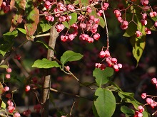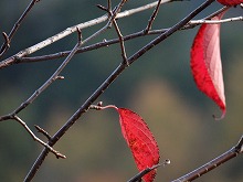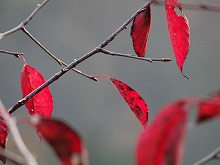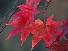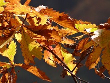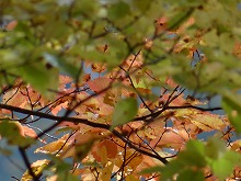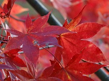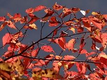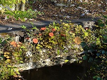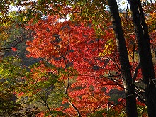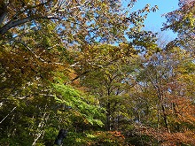 秋の日をいっぱいに浴びた木の影が路面に長々と横たわる。小川にかかる名もなき石橋をとりどりの色をした葉が包んでいる。唱歌の「真っ赤な秋」さながら、一様に赤い葉をつけた楓が燃えている。坂をくだりカーブを曲がる度、違う秋の唱歌を思い出す。同一樹種の単相林でないためなのであろう。