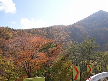カーブを曲がる度、だんだんと視界が下がってくる。大谷川の谷のなかを下がってくる。谷の両側がせりあがってくる。目を凝らすと明智平ロープウェイも確認できた。とはいっても眼下には坂の続きがあり、さっき脇を抜けて行った車がだいぶ下を走っている。山道ドライブの感を深くする。28番「く」、30番「ま」や34番「え」カーブ付近では、常緑の針葉樹の林に中を進むこともあるが、大抵は落葉する広葉樹のなかを進む。