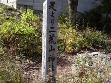途中の鞍部となる剣が峰から、これまで通ってきた坂を振り返ると、その山肌にも錦があり、砂防工事の結果できたであろう大滝が見えた。また昭和におけるいろは坂改修工事を記念したレリーフが掲示されている(*3)。剣が峰まで来るとだいぶ下ってきたため、遥かに見晴るかす眺望は失われる。反面、山懐深くにいる趣となり引き返すようなカーブ(43番「ゑ」)では男体山の山頂を仰ぎ見ることができるようになる。44番「ひ」カーブ付近からは、山水画のような急崖に鮮やかな紅葉が点在し、渋くも華やかに思える光景が展開する。既に標高は1,000mを切っている。47番「す」、48番「ん」と続き、めくるめくいろは坂は沢筋まで下りてきて穏やかに終わる。「是より二荒山神社境内」の石碑が立っている。かつてはこの第一いろは坂しかなかったのだから、往時はここから歩みを始めたことが窺い知れる。