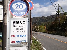 上りの第二いろは坂をあわせる馬返、豊川稲荷のある横手を過ぎ、細尾入口バス停まで下る。既に1時を過ぎている。実は12時ごろにはこの場所に立っていたかった。今日も予定より遅いチェックポイント通過となった。ここから大谷川沿いにまっすぐ行けば日光市街になるが、ここで右に折れ、細尾集落を経て足尾を目指す。足尾まで17kmの標識があった。足尾市内の終点と考えている、わたらせ渓谷鉄道・通洞駅発は18時28分を予定している。5時間あるが、やや苦しい。17kmは日足トンネルを経ていく国道での距離であるので、これから進もうとしている羊腸たる細尾峠経由では、かなりの距離になるだろう。「日光で遊んでから、ついでに来ようなんて、俺をなんだとおもってやがるんだい。2回目だよ、2回目。まだ懲りないのかい。」と、足尾銅山に呪われているかもしれない。ちょっと強引につなぎ過ぎなのかもしれない。