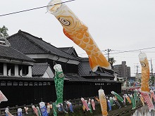 岡田記念館を過ぎ、現代の栃木市の中心部に近づいても、いくつか由緒ある建築物が点在して楽しませてくれる。「伝統的建造物群保存地区」であるのだから見所が連続しているのはある意味当然であるが、なかなかに楽しい。しかし観光地として宣伝されているのは実はもっと南側の地区にある。栃木市役所と東武デパートが一体となったビルで一服してから更に歩いていくと、巴波川沿いの遊歩道にでる。曇天であり、また既に5時を回り薄暮になっているのでランプに明かりが点っている。横山郷土館、塚田歴史伝説館といったスポットは営業時間を過ぎてしまい、これらも外から眺めるだけだが、それでもよい。季節柄であろう、塚田歴史伝説館前の巴波川上空には、色とりどり無数の鯉のぼりが泳いでいる。漆黒の店舗に色彩を添えて、絵になる光景になっている。と、十分に栃木の街を縦断して楽しんだのち、雨が落ちてきた。朝の思惑とは異なり栃木駅まで歩くことにする。今回の中断点は栃木駅となった。